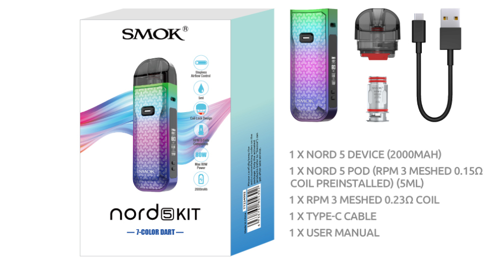 Smok is a company that has been on the Irish market for years and continues to bring out incredible products, especially as far as pod devices go. The new Smok Nord 5 kit is a vast improvement on their previous Nord series of devices, now switching things up by removing the Nord coil compatibility and have replaced this with their super-popular RPM and RPM-2 coils ranges. On top of this, the Nord 5 pod offers a brand new Airflow control wheel for customizing the vape to your exact tastes. This new Nord 5 kit from Smok is distinguished by its many colors and the shape of its lines. But that’s not all as it comes in a leather version for a very comfortable and pleasant grip. The leather version is a little larger than the classic version with dimensions of 106 x 32.5 x 24.8 mm against 105 x 32.5 x 23.74 mm. For the rest of the characteristics, there is no difference between the two versions except one which will be specified in the continuation of this card.